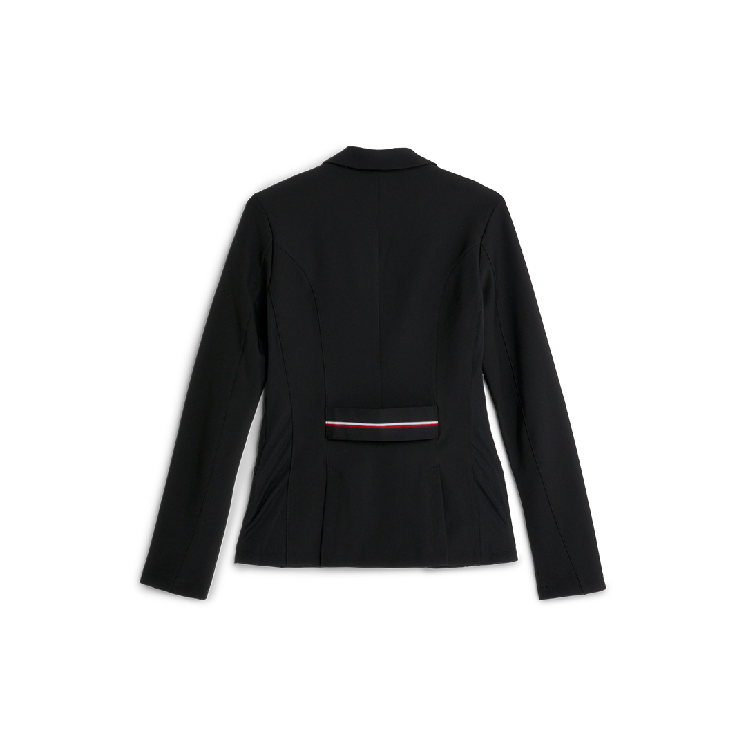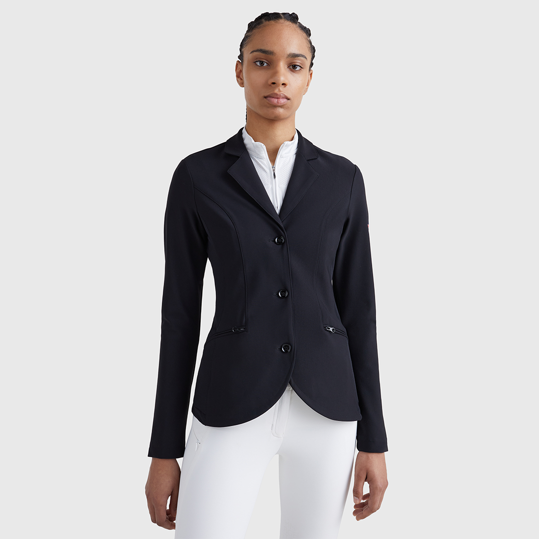 Performance-showjacka gjord av ett lätt powerstretch-tyg och mesh-inlägg på sidorna. Har en stängning med 3 knappar med dold dragkedja framtill, 2 fickor med dragkedja och 2 dolda ventiler bak. Flaglogotypbroderi på vänster överarm, tri-etikett i Tommy Hilfiger Stripe-look och kontrasterande foder avslutar looken. Logotypen är FEI-kompatibel.